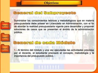 Este documento presenta información sobre un módulo de presupuesto público dictado por el Prof. Antonio L. Flores D. Los objetivos del módulo son proporcionar conocimientos teóricos y metodológicos sobre presupuesto a los estudiantes de administración para que puedan abordar problemas de la administración pública. El módulo cubrirá conceptos como presupuesto público, finanzas públicas, gasto e ingreso público y el marco jurídico que los regula.