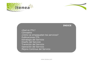 Este documento presenta una introducción a la gestión de servicios TI según el marco ITIL. Explica conceptos clave como procesos, funciones, roles, servicios y ciclo de vida del servicio. También describe brevemente las publicaciones de ITIL y los objetivos de implementar este marco, que son alinear los servicios TI con las necesidades del negocio, mejorar la calidad de los servicios y reducir costes a largo plazo.