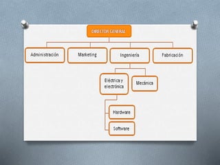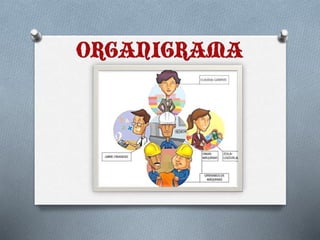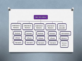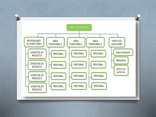 El documento describe tres tipos de organigramas (estructura funcional, estructura por finalidades y estructura matricial) para representar las relaciones jerárquicas en un proyecto u operación. La estructura funcional se basa en la naturaleza de las tareas, mientras que la estructura por finalidades identifica los órganos principales por su objetivo. La estructura matricial rompe con el principio de unidad de mando al tener directivos responsables de unidades y de operaciones.