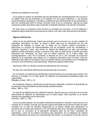 El documento presenta una introducción al concepto de currículum, discutiendo su etimología y evolución histórica. Examina diferentes definiciones de currículum, distinguiendo entre currículum formal, real y oculto. Finalmente, analiza las complejidades en conceptualizar el currículum debido a que es un constructo social que cambia a través del tiempo y contexto histórico.