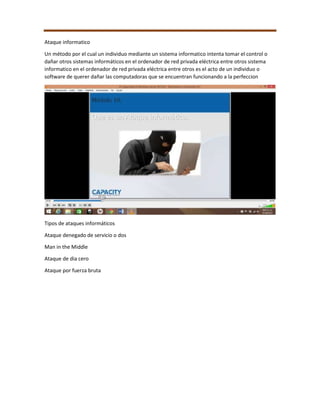 Este documento habla sobre la seguridad básica para Windows Server 2012. Explica conceptos clave como la seguridad de la informática versus la seguridad de la información, diferentes tipos de ataques informáticos como denegación de servicio y fuerza bruta, y los riesgos de tener sistemas vulnerables. También cubre los pilares de la seguridad informática como la confidencialidad, integridad y disponibilidad, el firewall de Windows, y la importancia del manejo de riesgos.