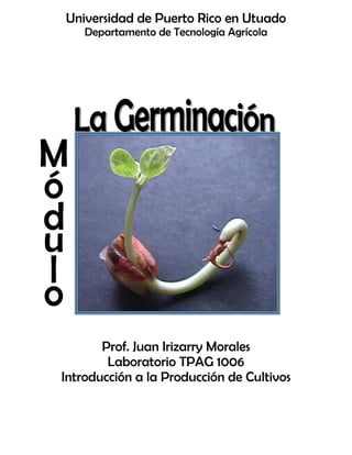 Este documento presenta información sobre el proceso de germinación de las semillas. Define la germinación como el reinicio del crecimiento del embrión después de estar paralizado durante la maduración de la semilla. Explica que la germinación involucra etapas como la imbibición de agua, elongación celular, división celular y diferenciación de tejidos. También describe los factores que afectan la germinación como la disponibilidad de agua, temperatura, aireación y presencia de oxígeno.