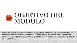 Este documento describe los pasos para establecer una microempresa cooperativa mediante el desarrollo de controles administrativos, contables, financieros y de producción. Propone crear un plan de negocio que incluya un resumen ejecutivo, descripción de la empresa, análisis de mercado, detalles del producto o servicio, estructura organizacional, plan de marketing y ventas, y plan financiero, con el objetivo de generar autoempleo y empleo en la comunidad.