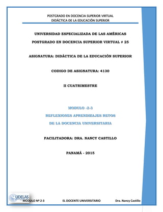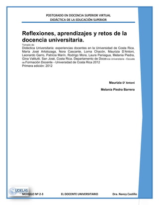 Este documento resume las reflexiones y aprendizajes sobre la docencia universitaria en el contexto actual. Explica que el Departamento de Docencia Universitaria de la Universidad de Costa Rica ofrece cursos de capacitación para profesores universitarios. También analiza los retos que enfrentan los profesores debido a los cambios tecnológicos y las demandas actuales, y la necesidad de cambiar hacia modelos educativos más centrados en el estudiante y el aprendizaje activo. Además, destaca la importancia de incorporar las tecnologías