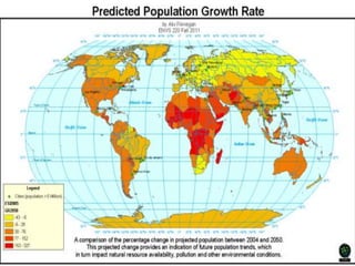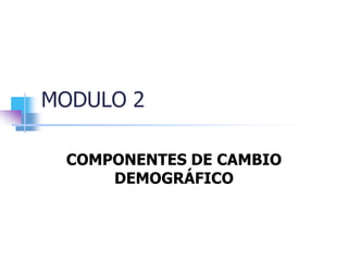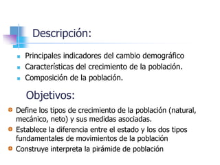 Este documento describe los componentes y medición del cambio demográfico. Explica los diferentes tipos de crecimiento de la población (natural, mecánico y neto), y cómo se calculan utilizando tasas e indicadores como natalidad, mortalidad e inmigración/emigración. También presenta modelos matemáticos como el aritmético, geométrico y exponencial para proyectar el crecimiento de la población basado en tasas pasadas.