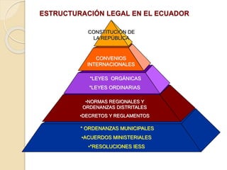 El documento presenta una guía sobre la gestión técnica de la seguridad y salud en el trabajo en Ecuador. Detalla la estructuración legal aplicable, incluyendo convenios internacionales, leyes y normativas nacionales y regionales. Luego explica los pasos clave de la gestión técnica: identificación de riesgos, medición, evaluación, control operativo e implementación de programas de vigilancia ambiental y de salud de los trabajadores.