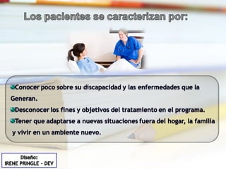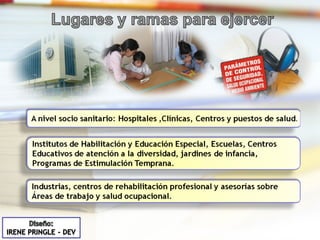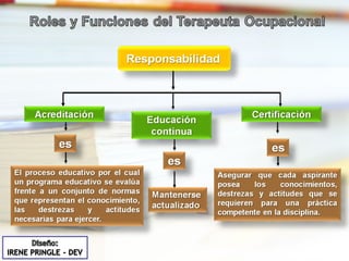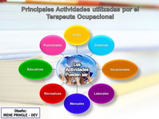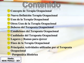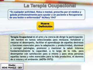La terapia ocupacional se utiliza como medio terapéutico para restaurar funciones físicas perdidas, tratar disturbios psicológicos y sociales, y alteraciones sensoriales, neurológicas y mentales. Los terapeutas ocupacionales aplican actividades para mejorar la movilidad, fuerza, coordinación, tolerancia al trabajo, y enseñar habilidades de la vida diaria. La terapia ocupacional también ayuda con problemas vocacionales y laborales, y trata con miedos, ansiedad y estrés emocional.