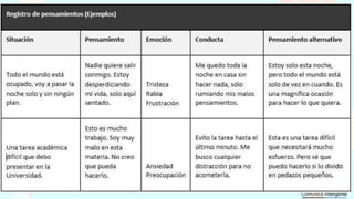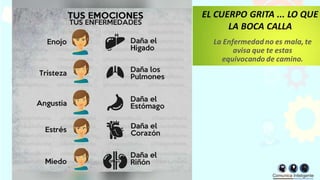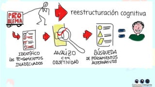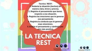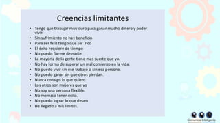 Este documento presenta información sobre el desarrollo de habilidades para manejar emociones y pensamientos limitantes. El objetivo es que los participantes aprendan técnicas como la reestructuración cognitiva, hacer peticiones positivas, y superar creencias limitantes. Se explican conceptos como el impacto de las emociones, la importancia de satisfacer necesidades, y cómo utilizar la técnica REST para modificar pensamientos negativos.