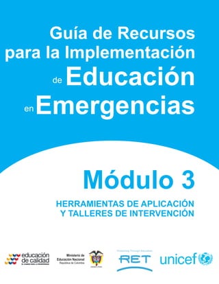 Este documento presenta una guía de recursos para la implementación de educación en emergencias en Colombia. Incluye herramientas de aplicación y talleres de intervención para la prevención, situaciones de crisis y emergencia, y la post-emergencia. Los talleres abordan temas como cartografía social, expresión de sentimientos, habilidades sociales y creatividad. El objetivo es fortalecer la educación en zonas afectadas por conflictos y desastres.