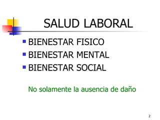 Este documento trata sobre salud laboral. Define trabajo, salud y salud laboral. Explica los tipos de accidentes de trabajo e identifica factores de riesgo como condiciones de seguridad, medio ambiente, carga de trabajo y organización del trabajo. Finalmente, clasifica los riesgos asociados a cada factor.