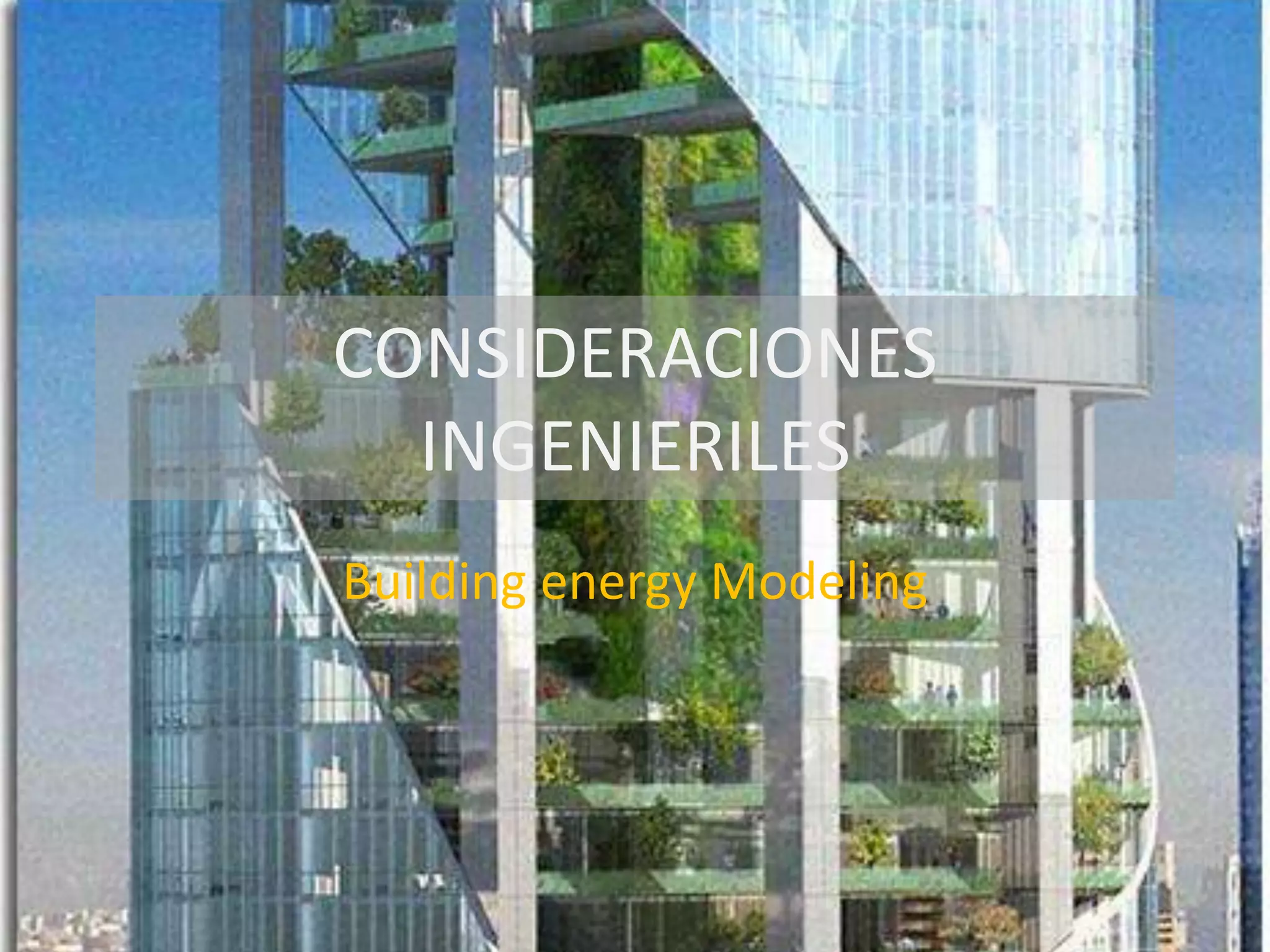 El documento discute el modelamiento energético durante las diversas etapas del diseño de edificios, enfatizando la importancia de realizar análisis energéticos tempranos para mejorar el desempeño del diseño. Se mencionan herramientas como el Design Performance Modeling y el Building Energy Modeling, que ayudan a predecir el uso energético y evaluar el desempeño real del edificio. Además, se abordan consideraciones sobre la instalación de sistemas solares y su impacto estructural, destacando la necesidad de optimizar el diseño para maximizar la eficiencia energética.