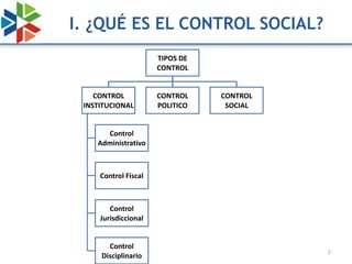 El documento describe el concepto de control social como una forma de participación ciudadana para vigilar y controlar asuntos del Estado con el fin de mejorar la responsabilidad y la integridad en la gestión pública. Explica los diferentes tipos de control y los protagonistas del control social. También analiza el marco normativo del control social en la Constitución colombiana y los escenarios de participación ciudadana. Por último, presenta una estrategia para promover y acompañar el control social a nivel regional y local.
