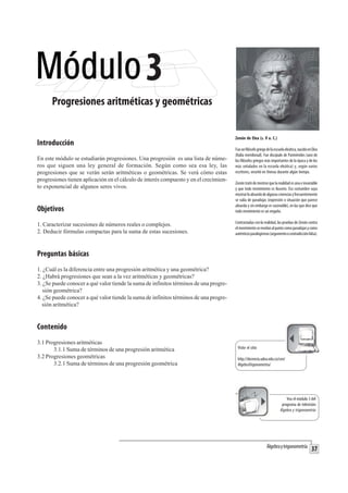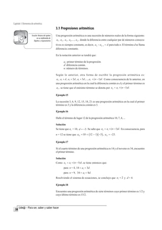 Este documento describe progresiones aritméticas y geométricas. Explica que una progresión aritmética es una lista de números donde la diferencia entre términos consecutivos es constante, mientras que en una progresión geométrica la razón entre términos consecutivos es constante. También proporciona fórmulas para calcular la suma de los términos de una progresión aritmética o geométrica.