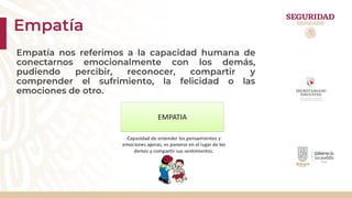 El documento describe la empatía como la capacidad humana de conectarse emocionalmente con los demás para percibir, reconocer, compartir y comprender sus emociones. Explica que la empatía es tanto una habilidad cognitiva como emocional que nos ayuda a entender los sentimientos y motivos de comportamiento de los demás para prevenir conflictos. Además, destaca que la empatía permite comprender las perspectivas de los demás, anticipar sus reacciones y contribuye al bienestar común al fomentar el respeto hacia los dem