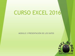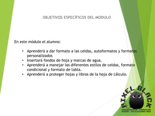 Este módulo cubre la presentación de datos en Excel 2016, incluyendo dar formato a celdas, insertar fondos y marcas de agua, usar estilos condicionales y de tabla, y proteger hojas y libros. Se enseñarán técnicas como formatos de celdas personalizados, autoformatos, estilos de celdas, y permitir acceso selectivo a celdas protegidas.