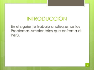 Este documento analiza los principales problemas ambientales en el Perú, incluyendo la acelerada destrucción de bosques amazónicos debido a la deforestación, la contaminación de cursos de agua por relaves mineros y descarga de aguas negras, y la sobrepesca que altera los recursos marinos. También discute la escasez de recursos hídricos y el cambio climático, siendo el Perú uno de los países más vulnerables a este último problema.