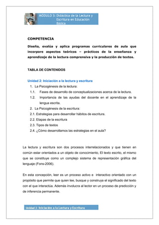 Este documento presenta información sobre la psicogénesis de la lectura y la escritura. Explica que la lectura y la escritura son procesos interrelacionados que siguen un desarrollo evolutivo en los niños. Describe las diferentes etapas por las que pasan los niños en el aprendizaje de la lectura, desde considerar el dibujo y el texto como lo mismo hasta comprender las letras y sonidos. También detalla las etapas de la psicogénesis de la escritura desde hipótesis presilábicas hasta la