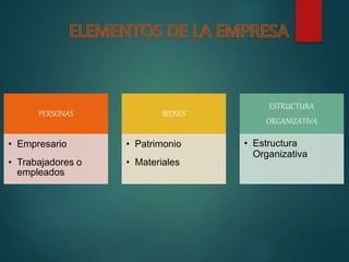 El documento describe los componentes básicos de una empresa. Una empresa es una unidad económica que se encarga de la producción, comercialización y administración. Está compuesta por empresarios, trabajadores, bienes y una estructura organizativa jerárquica. La empresa produce bienes y servicios a través de funciones como producción, abastecimiento, comercialización, financiera, investigación y desarrollo e investigación.