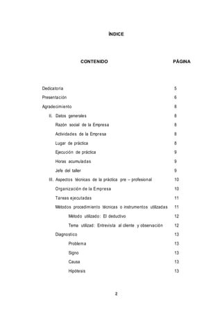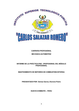 [1] El practicante realizó su práctica pre-profesional en el Centro Técnico Automotriz "El Profe E.I.R.L", donde aprendió sobre el mantenimiento de motores de combustión interna. [2] Como parte de su práctica, el practicante diagnosticó y reparó un motor que presentaba problemas como pérdida de compresión. Esto involucró el desmontaje completo del motor, inspección y medición de sus componentes, y su posterior armado. [3] El practicante aplicó métodos deductivos y