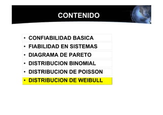 Este documento presenta los conceptos básicos de la confiabilidad aplicada a sistemas, incluyendo la definición de componente, equipo y sistema. Explica los diferentes tipos de sistemas (serie y paralelo) y cómo calcular su confiabilidad. También introduce conceptos como el diagrama de Pareto y distribuciones de probabilidad comúnmente usadas en confiabilidad como la binomial y de Poisson.