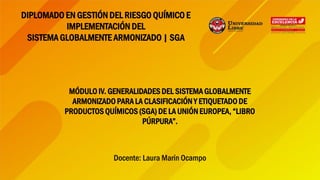 Este documento presenta información sobre el Módulo IV del Diplomado en Gestión del Riesgo Químico e Implementación del Sistema Globalmente Armonizado (SGA). El módulo explica las generalidades del SGA de la Unión Europea, cuyo propósito es unificar conceptos sobre seguridad química a nivel mundial y brindar recomendaciones sobre la información que debe contener una ficha de datos de seguridad y etiqueta de un producto químico. El SGA identifica los peligros intrínsecos de sustancias y