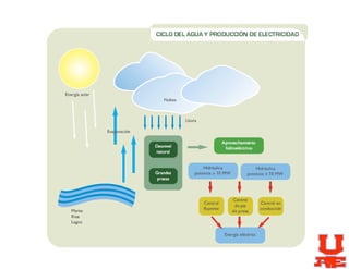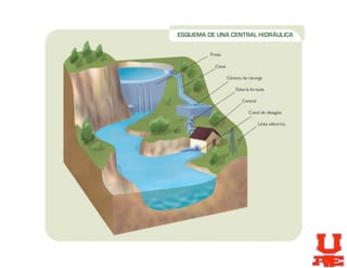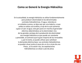 La energía hidráulica se utiliza principalmente para generar electricidad en centrales hidroeléctricas, donde el agua en un embalse hace girar una turbina conectada a un generador. Aunque presenta ventajas como la producción constante de electricidad y la no emisión de CO2, la construcción de grandes infraestructuras puede generar impactos ambientales y humanos, lo que la hace no estrictamente renovable. Existen clasificaciones según la potencia, destacando las centrales mini-hidráulicas que son menores de 10 MW y aprovechan recursos hídricos de manera más modesta.