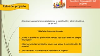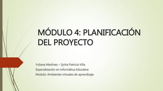 Este documento presenta un módulo sobre la planificación de proyectos. Explica cómo elaborar una planificación que cubra todos los aspectos de un proyecto utilizando herramientas como cronogramas. También describe estrategias para administrar los recursos, el tiempo, la colaboración y informar sobre el proyecto. El módulo concluye reflexionando sobre los beneficios de aprender sobre la planificación de proyectos para mejorar las prácticas pedagógicas.