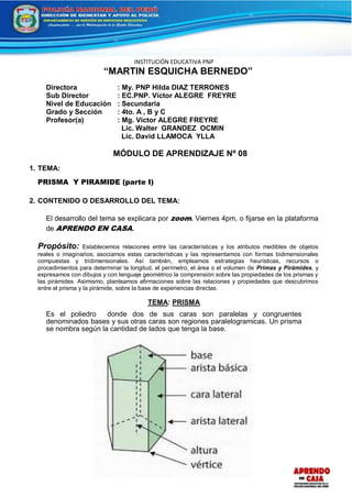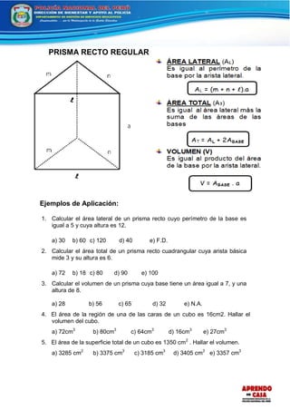 Este documento presenta información sobre prismas y pirámides. Explica las características de los prismas y pirámides, incluidas sus definiciones, ejemplos y fórmulas para calcular el área y volumen. También incluye ejercicios de aplicación para que los estudiantes practiquen el cálculo del área y volumen de prismas y pirámides.