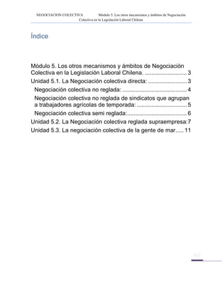 Este documento presenta un resumen de los diferentes mecanismos y ámbitos de negociación colectiva contemplados en la legislación laboral chilena. Explica la negociación colectiva directa no reglada que pueden realizar los sindicatos, así como la negociación semi-reglada de sindicatos de trabajadores agrícolas temporales. También describe los procedimientos de negociación colectiva reglada supraempresa que involucra a más de una empresa y la negociación colectiva específica para gente de mar. El objetivo general es revisar est