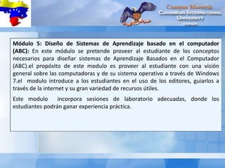 Este documento presenta la descripción de tres unidades de aprendizaje para un curso sobre diseño de sistemas de aprendizaje basado en computadoras. La primera unidad cubre la introducción a las computadoras personales. La segunda unidad trata sobre los fundamentos de Windows 7. La tercera unidad se enfoca en los fundamentos de Internet y cómo utilizar herramientas como correo electrónico, aulas virtuales y motores de búsqueda. Cada unidad incluye objetivos, contenido, actividades y estrategias de evaluación.