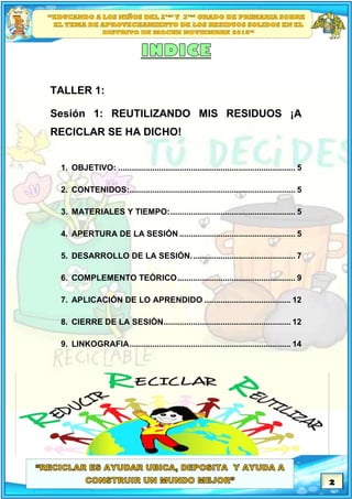 Este documento presenta una sesión de capacitación sobre reutilización de residuos sólidos dirigida a niños de segundo y tercer grado. La sesión cubre la definición y clasificación de residuos sólidos, sus consecuencias y la importancia de su reutilización. Se utilizan varias técnicas participativas como lluvia de ideas, formación de grupos y juegos para enseñar e involucrar a los niños. Al final, los niños aplican lo aprendido creando manualidades con materiales reciclados.