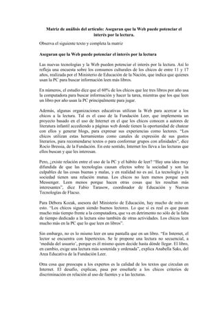 Este documento presenta un resumen de un artículo periodístico sobre el efecto de la web y la tecnología en el hábito de lectura entre los jóvenes. Según encuestas, los jóvenes que más usan la computadora para buscar información tienden a leer más libros, mientras que quienes usan la PC principalmente para juegos leen menos. Aunque la tecnología no es la única causa del descenso en la lectura, sí afecta el tiempo dedicado a ella. La web también puede potenciar el interés por la
