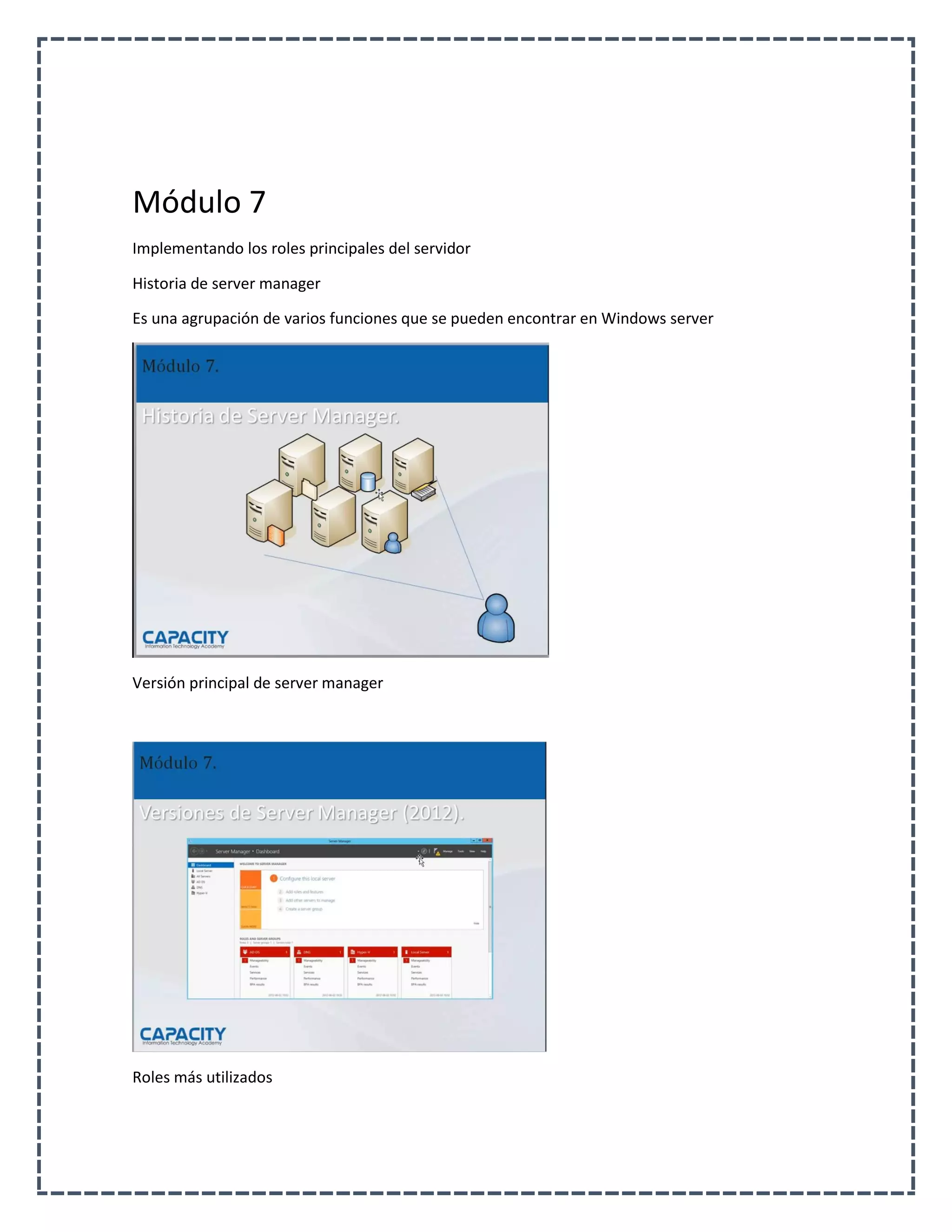 Este documento describe los principales roles de servidor en Windows server como DHCP, DNS y ADDS para asignación de direcciones IP, resolución de nombres y manejo de computadoras respectivamente. También menciona roles como backup, acceso remoto, servidor de aplicaciones e impresión.