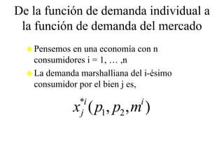 El documento resume los conceptos fundamentales de la demanda de mercado y la elasticidad. Explica que la demanda de mercado es la suma horizontal de las demandas individuales de los consumidores. También define la elasticidad como una medida de la sensibilidad de una variable ante cambios en otra variable, y analiza la elasticidad precio de la demanda en particular.
