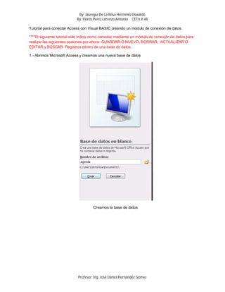Este documento proporciona un tutorial para conectar una base de datos de Access con Visual BASIC mediante la creación de un módulo de conexión de datos. El tutorial explica cómo crear una base de datos en Access, un proyecto en Visual BASIC, un formulario, un módulo de conexión y el código para realizar operaciones básicas como guardar, buscar, actualizar y eliminar registros.