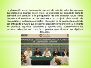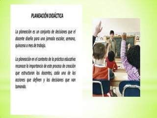 La planeación es un instrumento para orientar las acciones futuras mediante la prefiguración de situaciones futuras que respondan a necesidades y problemas. La didáctica estudia los recursos para dirigir el aprendizaje del alumno y llevarlo a alcanzar la madurez para enfrentar la realidad de manera consciente, eficiente y responsable. La planeación didáctica toma en cuenta elementos como los objetivos, contenidos, estudiantes, tiempo y métodos para lograr la consistencia interna y alcanzar las metas planteadas de manera eficiente.
