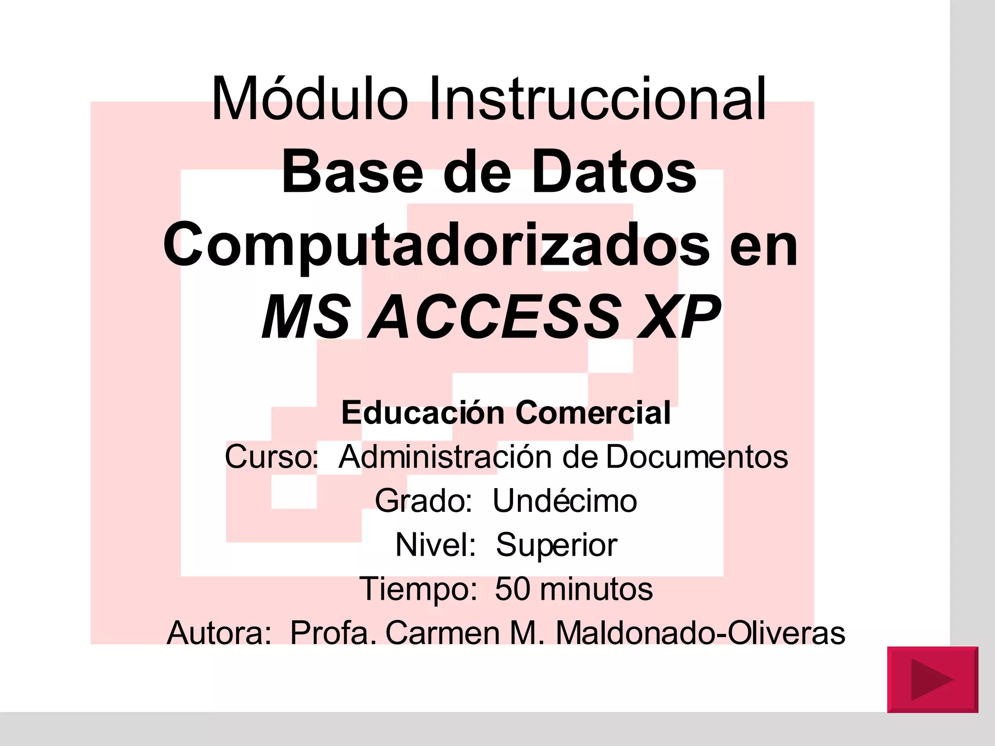 M ódulo InstruccionalBase de Datos Computadorizados en MS ACCESS XP Educación Comercial Curso: Administración de Documentos Grado: Undécimo Nivel: Superior Tiempo: 50 minutos Autora: Profa. Carmen M. Maldonado-Oliveras