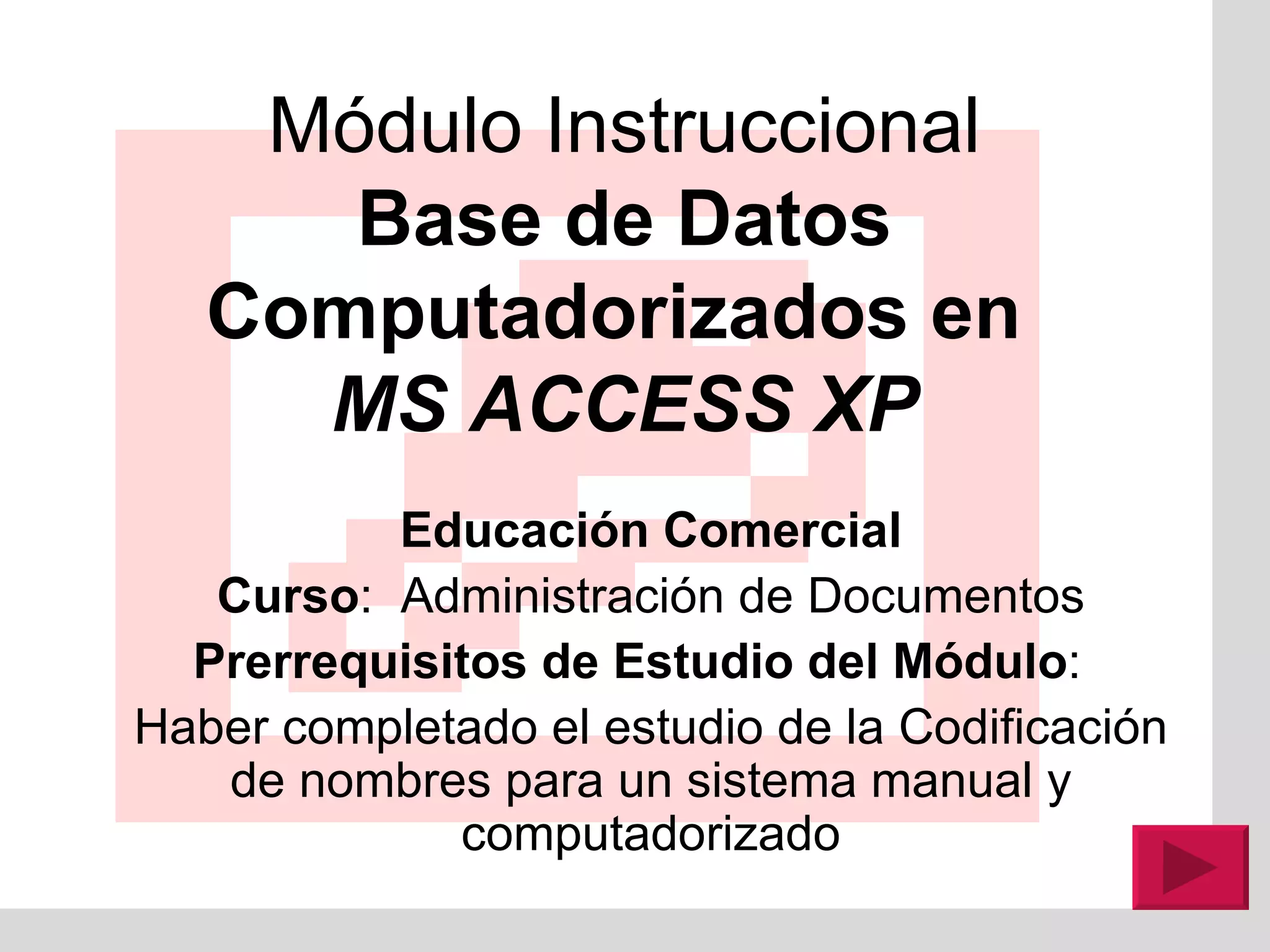 M ódulo InstruccionalBase de Datos Computadorizados en MS ACCESS XP Educación Comercial Curso : Administración de Documentos Prerrequisitos de Estudio del M ódulo : Haber completado el estudio de la Codificación de nombres para un sistema manual y computadorizado