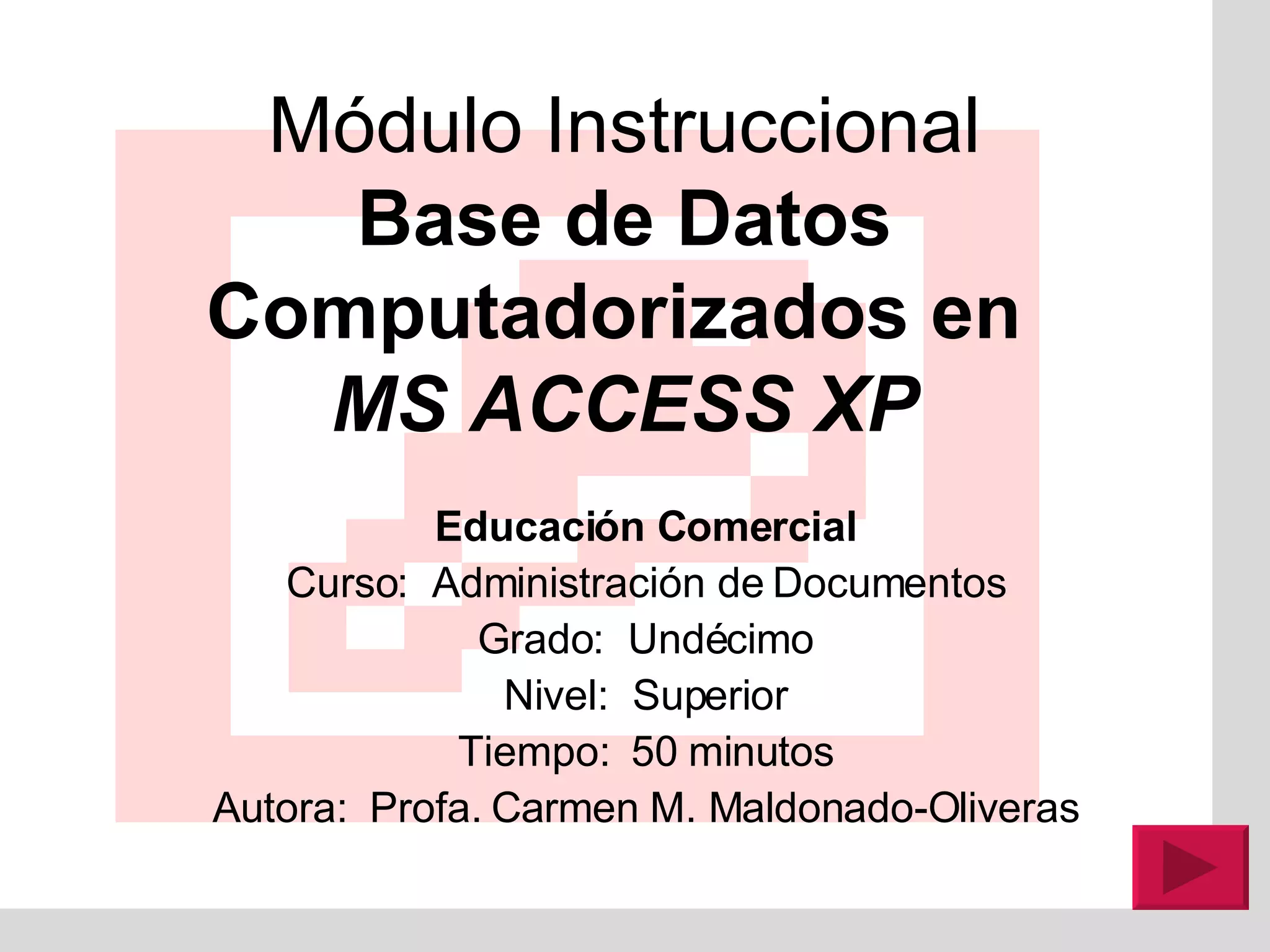 Este documento presenta un módulo instructivo sobre bases de datos en Access XP. Explica las funciones básicas de Access, incluyendo tablas, formularios, consultas, informes y otros objetos. Detalla los objetivos de aprendizaje y incluye actividades y ejercicios para que los estudiantes describan los componentes de una base de datos en Access y sus usos.