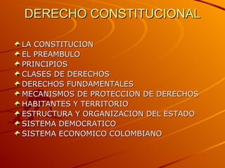 El documento presenta un resumen de los principales temas del derecho constitucional colombiano, incluyendo la constitución, los derechos fundamentales, los mecanismos de protección de derechos, la estructura del estado, y el sistema democrático y económico. También incluye información sobre los servicios de asesoría jurídica de la firma Litigantes & Consultores.