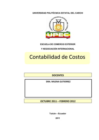 Este documento presenta una guía de aprendizaje sobre contabilidad de costos para estudiantes de la Escuela de Comercio Exterior de la Universidad Politécnica Estatal del Carchi. Incluye definiciones de contabilidad de costos, elementos del costo, diferencias entre empresas comerciales e industriales, y ejemplos de cálculo y registro de costos. El objetivo es desarrollar competencias profesionales en los estudiantes sobre el cálculo y análisis de costos para la toma de decisiones empresariales.