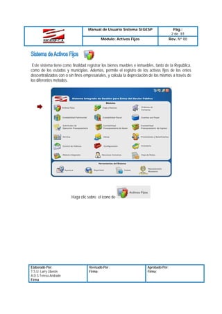 Este manual describe el módulo de activos fijos del Sistema SIGESP, el cual permite registrar bienes muebles e inmuebles y calcular su depreciación. Explica las opciones para definir métodos de rotulación, condiciones de activos, causas de movimiento, y registrar datos de activos como fecha de compra, costo, ubicación, y método de depreciación. También cubre la configuración del sistema para usar el catálogo SIGECOF o CGR.