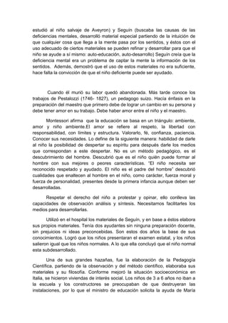 La Dra. Montessori fue la primera mujer médico en Italia y desarrolló un innovador método de educación basado en la observación científica de niños. Su método enfatizaba dar a los niños libertad en un ambiente preparado, para que pudieran desarrollarse a su propio ritmo a través de la auto-educación. Fundó la primera Casa de los Niños en 1907 en Roma, donde los niños aprendieron a leer y escribir de forma natural. Aunque su método tuvo éxito inicialmente, fue criticado y prohibido por los