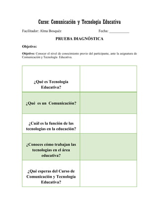 Este documento presenta un módulo de aprendizaje sobre comunicación y tecnología educativa impartido por Alma Bosquéz en 2018. Incluye una prueba diagnóstica, glosarios, temas a cubrir, roles del facilitador y una actividad de laboratorio sobre el rol del facilitador de tecnología en la educación actual usando la herramienta Kizoa.