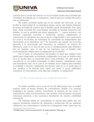 Este documento analiza los conceptos de cognición y conocimiento. Explica que la cognición se refiere a la acción de conocer mediante las facultades intelectuales. El conocimiento es la actividad que el ser humano realiza para comprender su entorno y desarrollarse. Sin embargo, reducir el conocimiento a una simple herramienta puede conducir al relativismo y el nihilismo. El conocimiento debe verse como algo más amplio que permite al ser humano despertar y cuestionar la realidad.