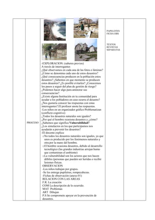 Este documento presenta un módulo de aprendizaje sobre la prevención de desastres naturales dirigido a estudiantes de cuarto grado. El módulo busca crear conciencia sobre la importancia de la prevención y explica los desastres naturales y antrópicos, así como estrategias para reducir su impacto. El aprendizaje se logra a través de actividades grupales, observación, conceptualización y práctica para desarrollar capacidades de defensa civil.