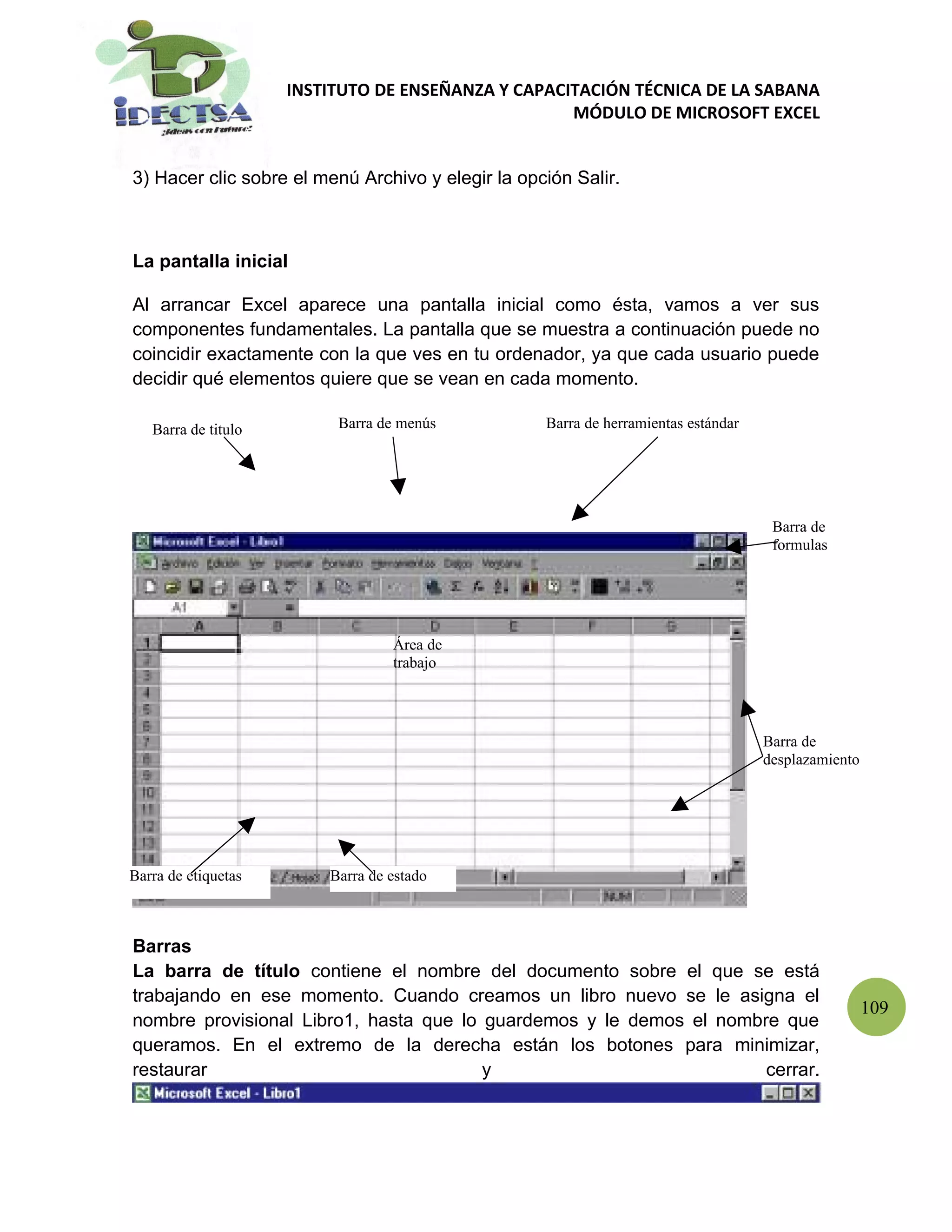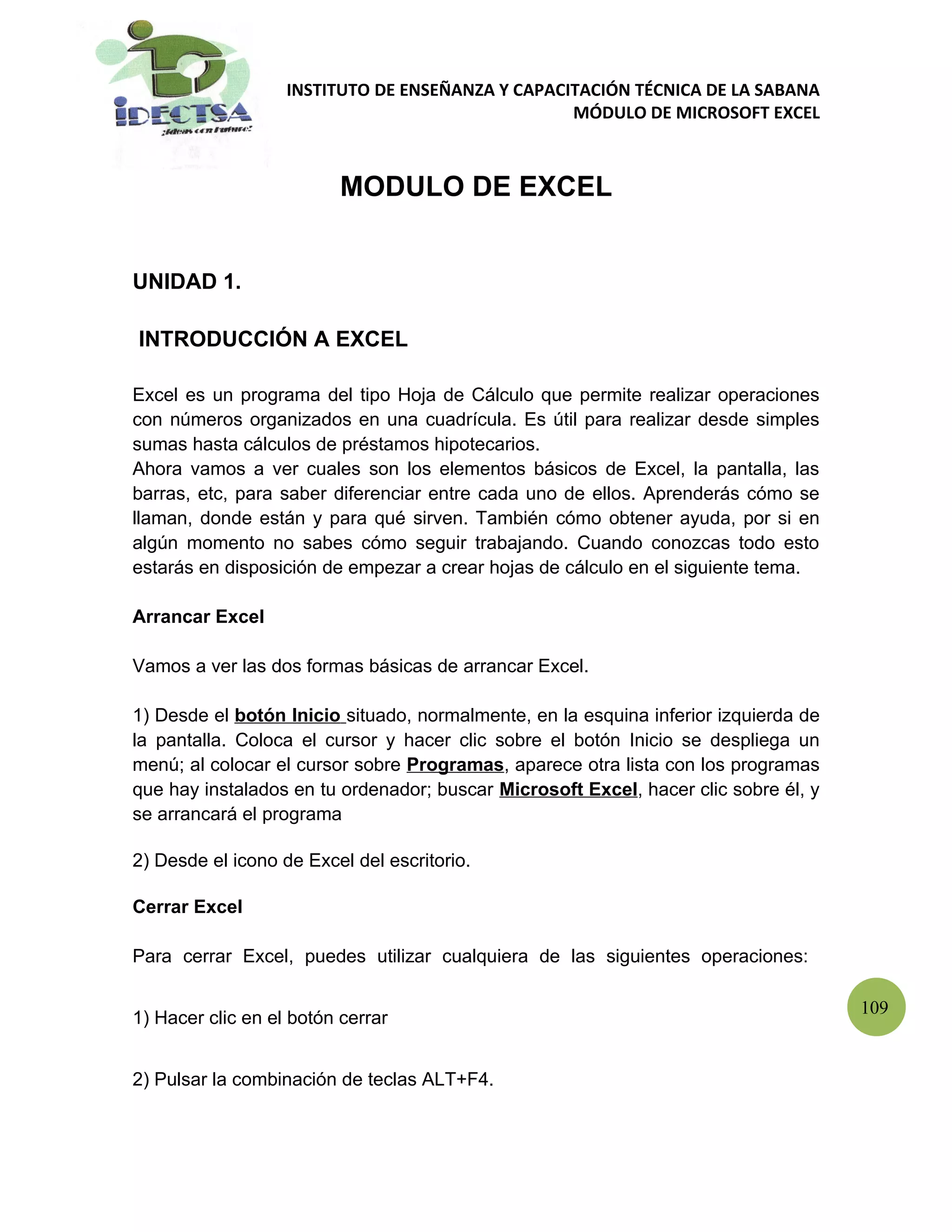 Este documento presenta un módulo de capacitación en Excel. Introduce Excel y sus elementos básicos como barras y paneles. Explica cómo abrir y cerrar Excel, y cómo moverse por una hoja de cálculo. Detalla los diferentes tipos de datos que se pueden introducir en celdas y varios métodos para seleccionar celdas u otras áreas para realizar operaciones. El documento proporciona instrucciones paso a paso sobre conceptos básicos de Excel para principiantes.