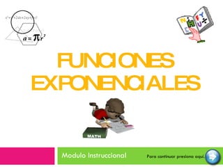 Este documento proporciona una introducción a las funciones exponenciales. Define funciones exponenciales, explora sus propiedades como ser crecientes o decrecientes dependiendo de la base, y muestra cómo graficarlas y resolver ecuaciones exponenciales. También presenta aplicaciones como el interés compuesto, crecimiento poblacional y decaimiento radiactivo. El documento concluye con una pre-prueba, la lección, ejercicios de práctica y una post-prueba para evaluar la comprensión del estudiante.
