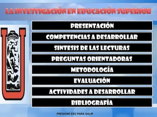Este documento describe el componente de investigación de un módulo. Se enfoca en analizar las políticas del Estado sobre ciencia y tecnología, así como los elementos constitutivos del sistema de investigación de una universidad. El método a utilizar es el seminario de investigación y taller pedagógico, con el fin de desarrollar competencias investigativas en los estudiantes. La evaluación será un proceso permanente que busca mejorar el rendimiento de los estudiantes.
