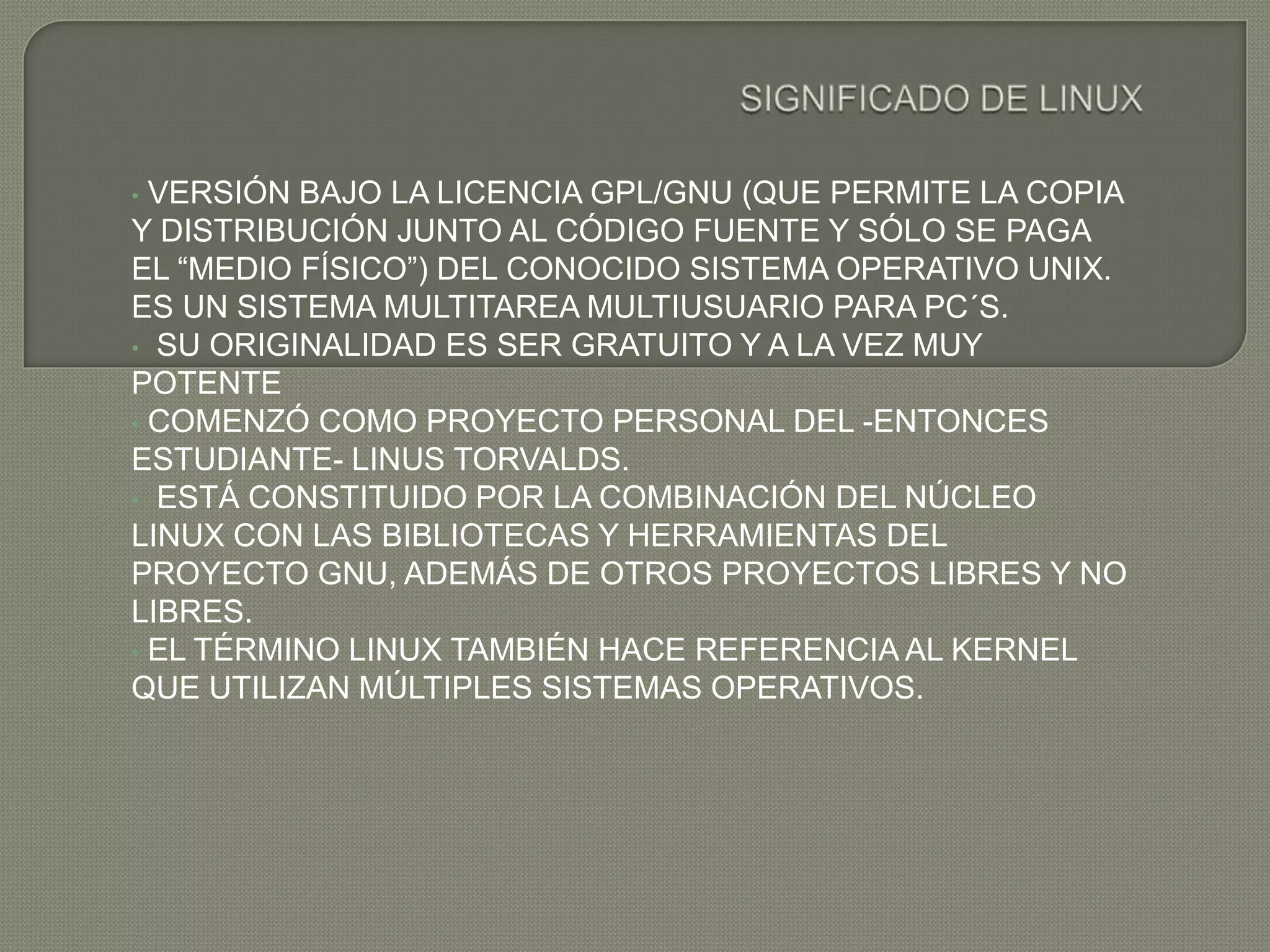 Linux es un sistema operativo libre y gratuito desarrollado originalmente por Linus Torvalds. Se distribuye bajo la licencia GPL y está constituido por el núcleo Linux junto con las herramientas y bibliotecas de GNU. Linux puede funcionar en una variedad de hardware y se utiliza comúnmente como sistema operativo servidor.